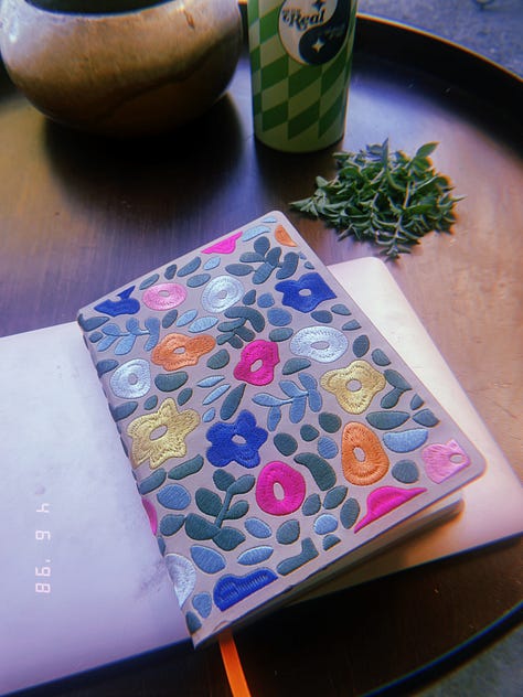 The New Journal my husband bought me. The design is both cute and has a cool feel due to the flowers being sewn onto the leather. It is a sensory experience. Plus the pages are lined and have a neat way to circle the day of the week and write the date.